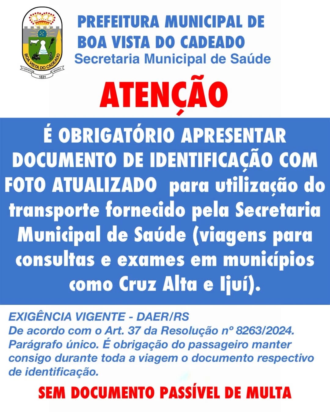 A prefeitura de Boa Vista do Cadeado chama atenção que para utilizar o transporte fornecido pela secretaria municipal de Saúde, destinado a pacientes que fazem exames e consultas em municípios como Cruz Alta e Ijuí, é obrigatório apresentar documento com foto atualizado. Passageiros sem documento poderão ter o embarque negado. Além disso, o transporte fica sujeito à multa em caso de falta de documentação do passageiro. Trata-se de determinação do Daer – Departamento Autônomo de Estradas de Rodagem.