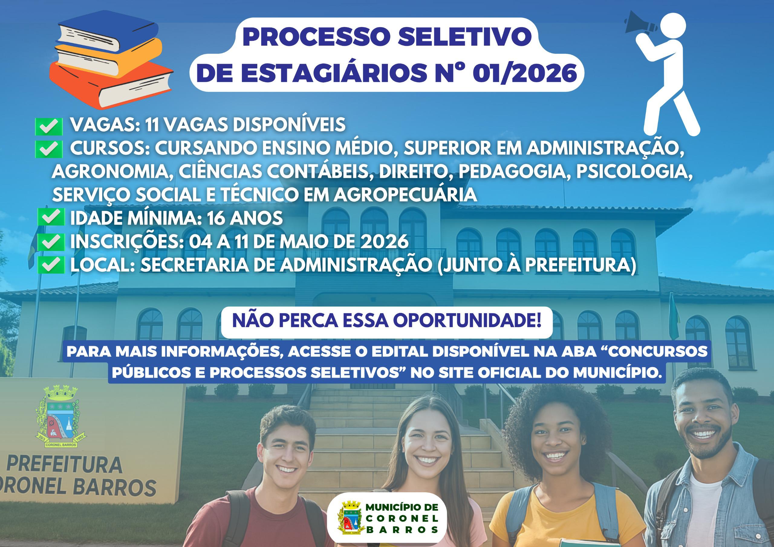 A Prefeitura de Coronel Barros lançou o Processo Seletivo de Estagiários nº 01/2026, abrindo oportunidades para estudantes que desejam adquirir experiência no serviço público. O edital, assinado pelo prefeito Bráulio Scherer, prevê vagas imediatas e cadastro reserva para alunos do ensino médio, técnico e superior, em áreas como Administração, Agricultura, Educação e Assistência Social. As vagas contemplam cursos como Administração, Agronomia, Ciências Contábeis, Direito, Pedagogia, Psicologia e Serviço Social, além de oportunidades para ensino médio e curso técnico em Agropecuária.