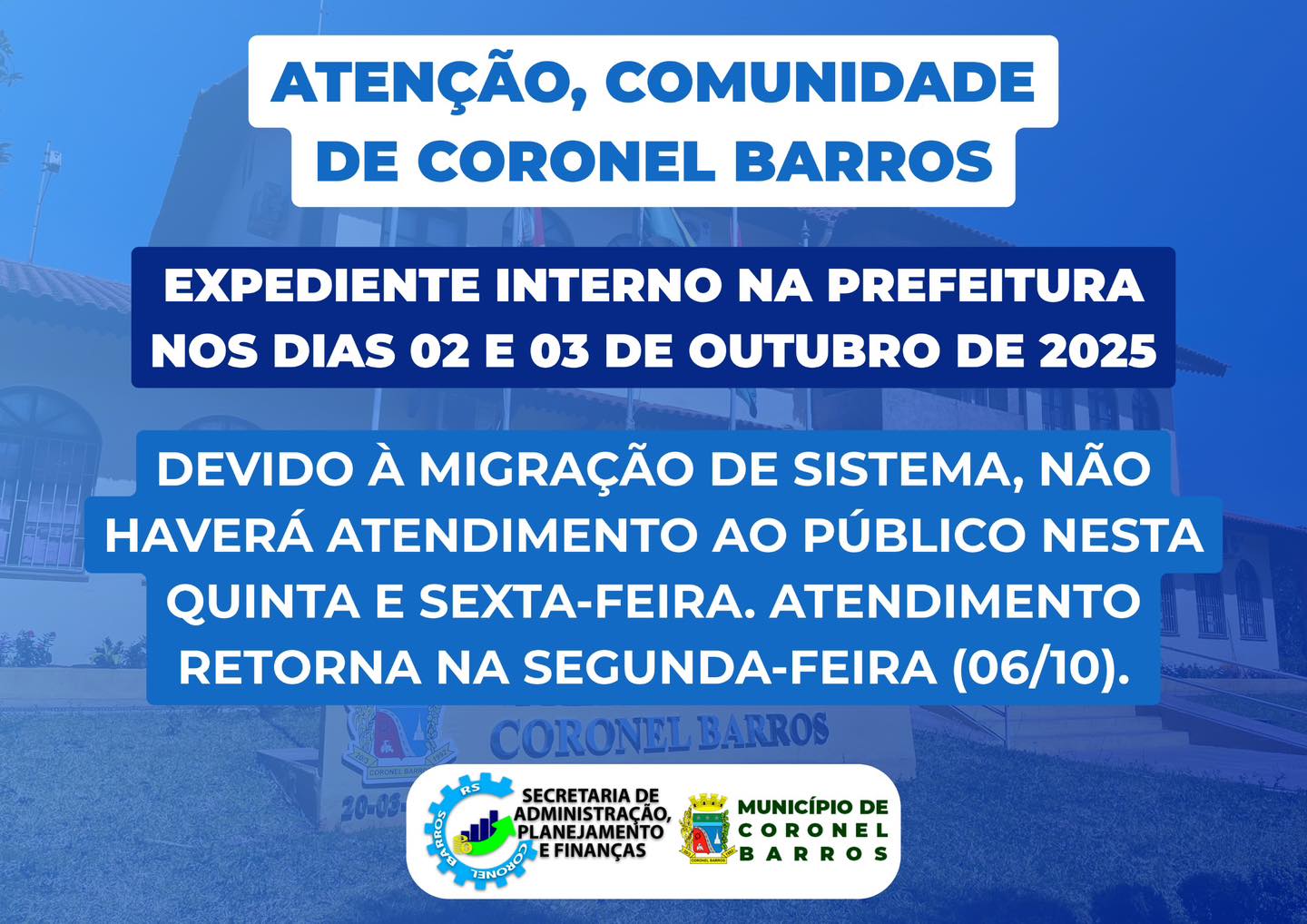 Nesta quinta e sexta-feira a prefeitura e Coronel Barros vai estar em expediente interno, devido à migração para novo sistema informatizado. Diante disso, o atendimento ao público vai ser retomado na próxima segunda-feira, 06. Segundo a administração de Coronel Barros, a modernização vai trazer mais agilidade, eficiência, segurança e transparência nos serviços oferecidos à população.