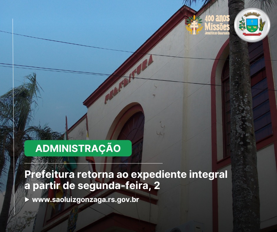 O turno único na prefeitura de São Luiz Gonzaga, em vigência desde dezembro passado, foi finalizado sexta-feira. A partir de hoje volta o expediente integral, de segunda a sexta-feira, das 8h às 11h30min e das 13h30min às 16h.