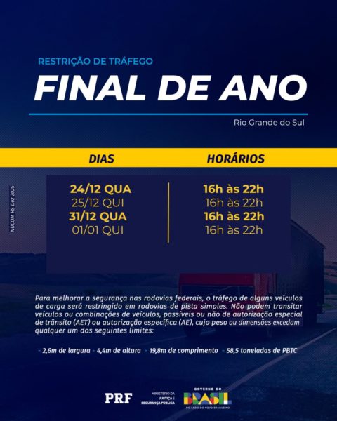 Além disso, durante alguns dias haverá restrição de veículos longos, por exemplo, rodotrens e bitrens, em determinados períodos em rodovias de pista simples. Dias 24, 25 e 31 de dezembro, além de primeiro de janeiro, esses veículos não poderão circular das 16 às 22 horas.