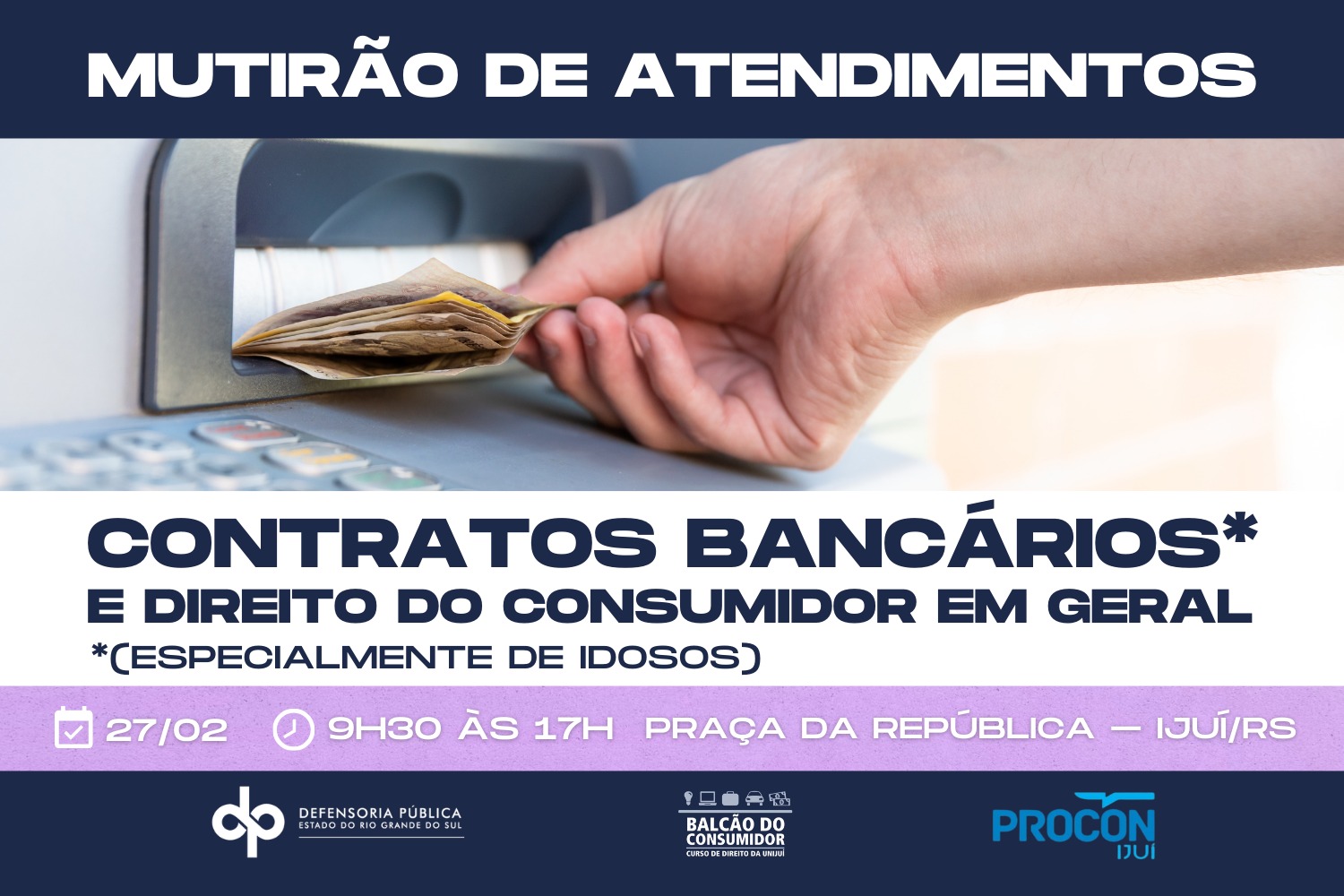 O Procon de Ijuí, em parceria com a Defensoria Pública do Estado do Rio Grande do Sul, realiza nesta sexta-feira, 27, um mutirão de atendimento voltado à análise de contratos bancários e à orientação sobre direitos do consumidor. A ação ocorre das 9h30 às 17h, na Praça da República, com atendimento ininterrupto ao meio-dia.