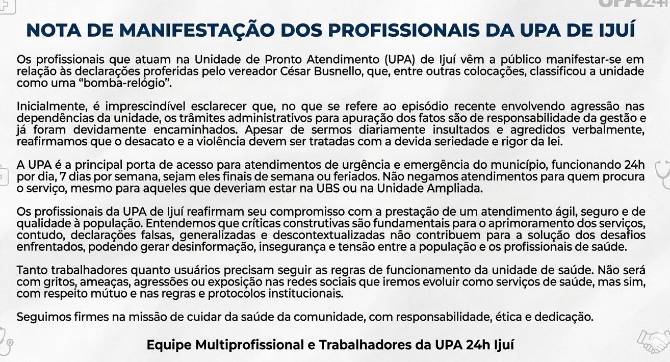 Os profissionais que atuam na Unidade de Pronto Atendimento (UPA) de Ijuí vêm a público manifestar-se em relação às declarações proferidas pelo vereador César Busnello, que, entre outras colocações, classificou a unidade como uma “bomba-relógio”.