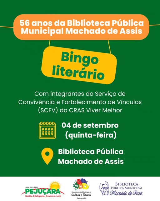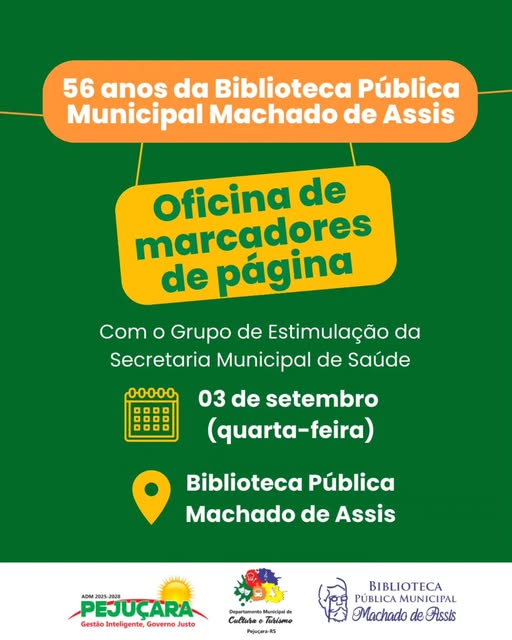 Nessa semana, acontece programação especial relativa aos 56 anos da biblioteca pública municipal Machado de Assis, de Pejuçara. Hoje acontece a “Biblioteca ao Ar Livre”, com exposição de livros em frente à biblioteca Machado de Assis, durante todo o dia.