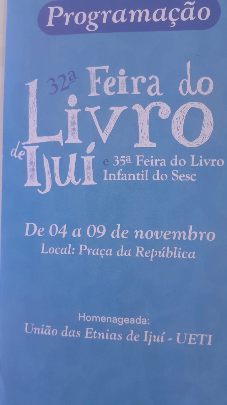 A programação da 32ª Feira do Livro de Ijuí e 35ª Feira do Livro Infantil do Sesc, hoje, vai começar às 8 horas e 30 minutos, quando haverá contação de história e apresentação de mágicas. Durante esta quinta-feira ainda haverá apresentações musicais, encontro com a escritora Carolina Daronco Romero, atividades com o Conselho Municipal de Pessoa Idosa, contação de histórias, dentre outras atividades. A feira do livro de Ijuí acontece na praça da República até domingo. Também existe participação de livrarias, com mostra e venda de livros dos segmentos infantil, literatura, religiosos e demais áreas.