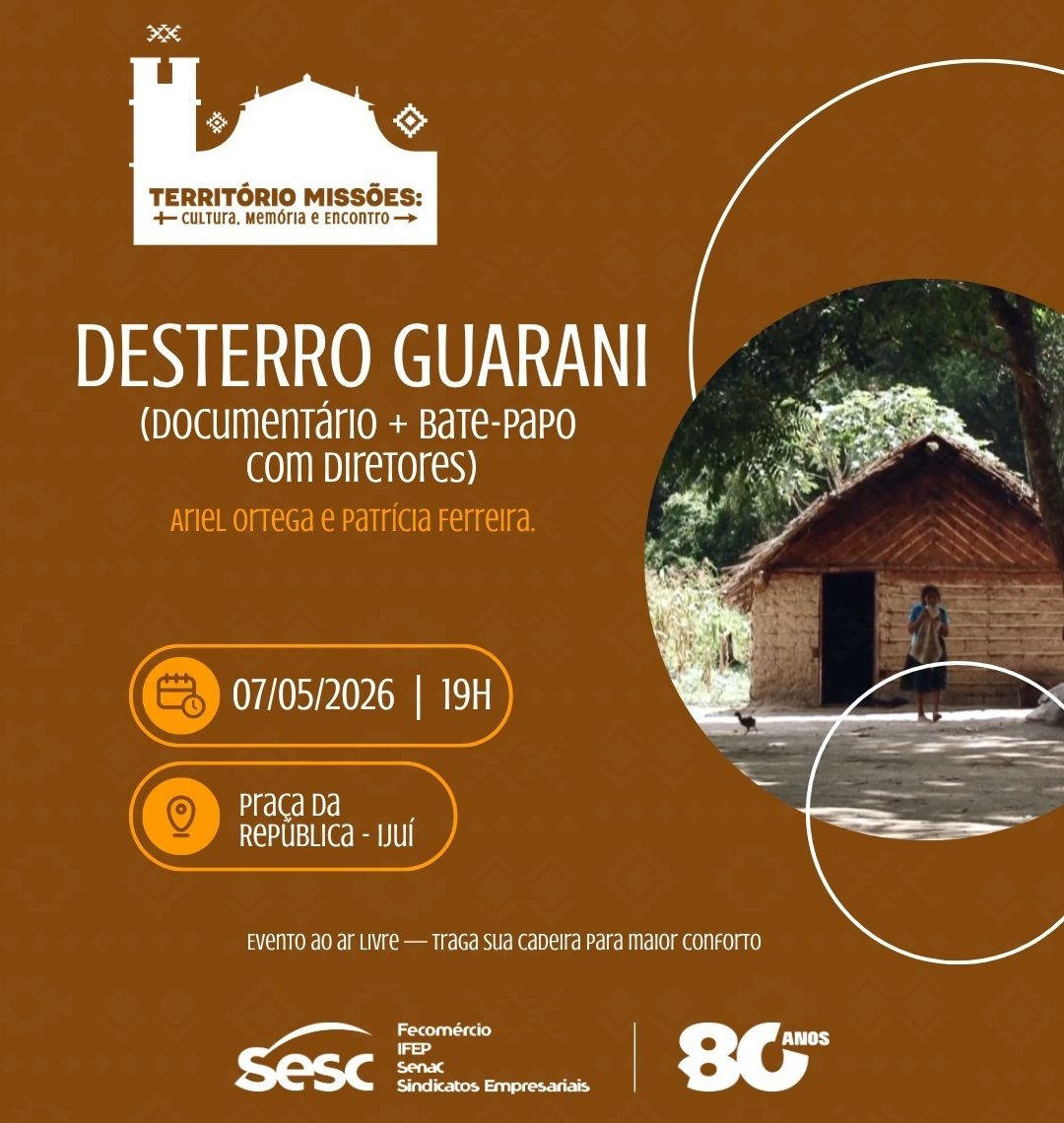 Entre os dias 3 e 9 de maio, o Sesc/RS dá início ao projeto “Território Missões: Cultura, Memória e Encontro” com uma série de atividades culturais gratuitas em diferentes cidades da região das Missões. A iniciativa propõe uma programação que se estende pelos meses de maio, junho e julho, reunindo cinema de rua, teatro para infâncias e música, em uma ocupação artística que valoriza a memória, o território e o protagonismo dos povos originários.