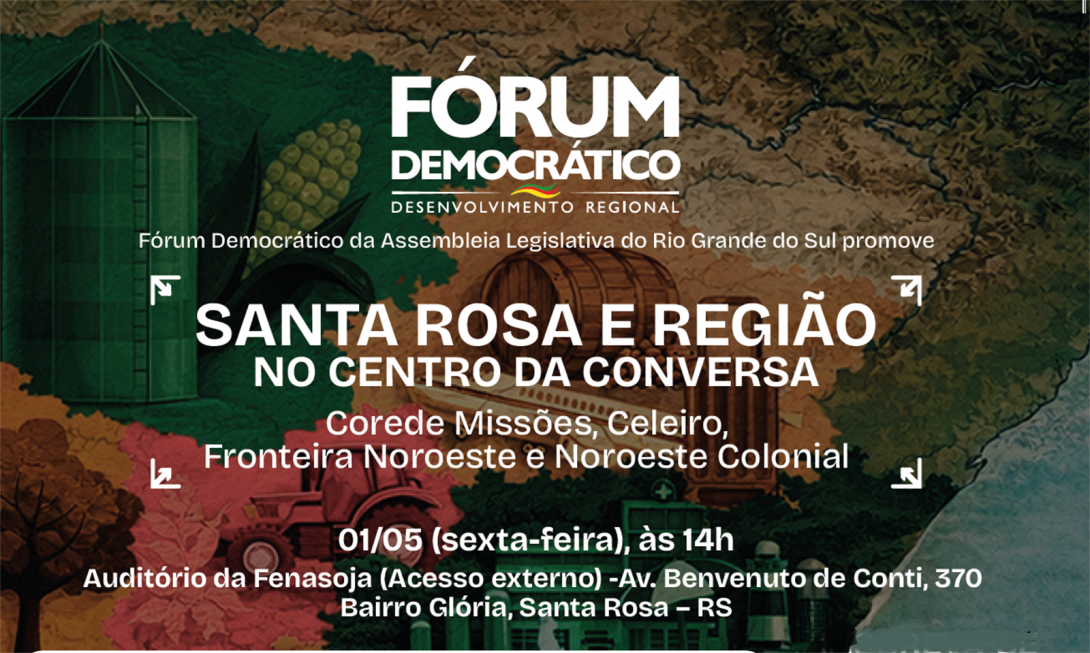 A 3ª Plenária Regional do Fórum Democrático de Desenvolvimento Regional da Assembleia Legislativa do Rio Grande do Sul será realizada nesta sexta-feira, 1º de maio, no auditório da Fenasoja, em Santa Rosa, integrando a programação oficial da feira, que ocorre de 1º a 10 de maio no município. O encontro acontece das 14h às 16h e reunirá lideranças políticas, prefeitos, vereadores, representantes de entidades regionais, universidades e comunidade das regiões Missões, Celeiro, Fronteira Noroeste e Noroeste Colonial.