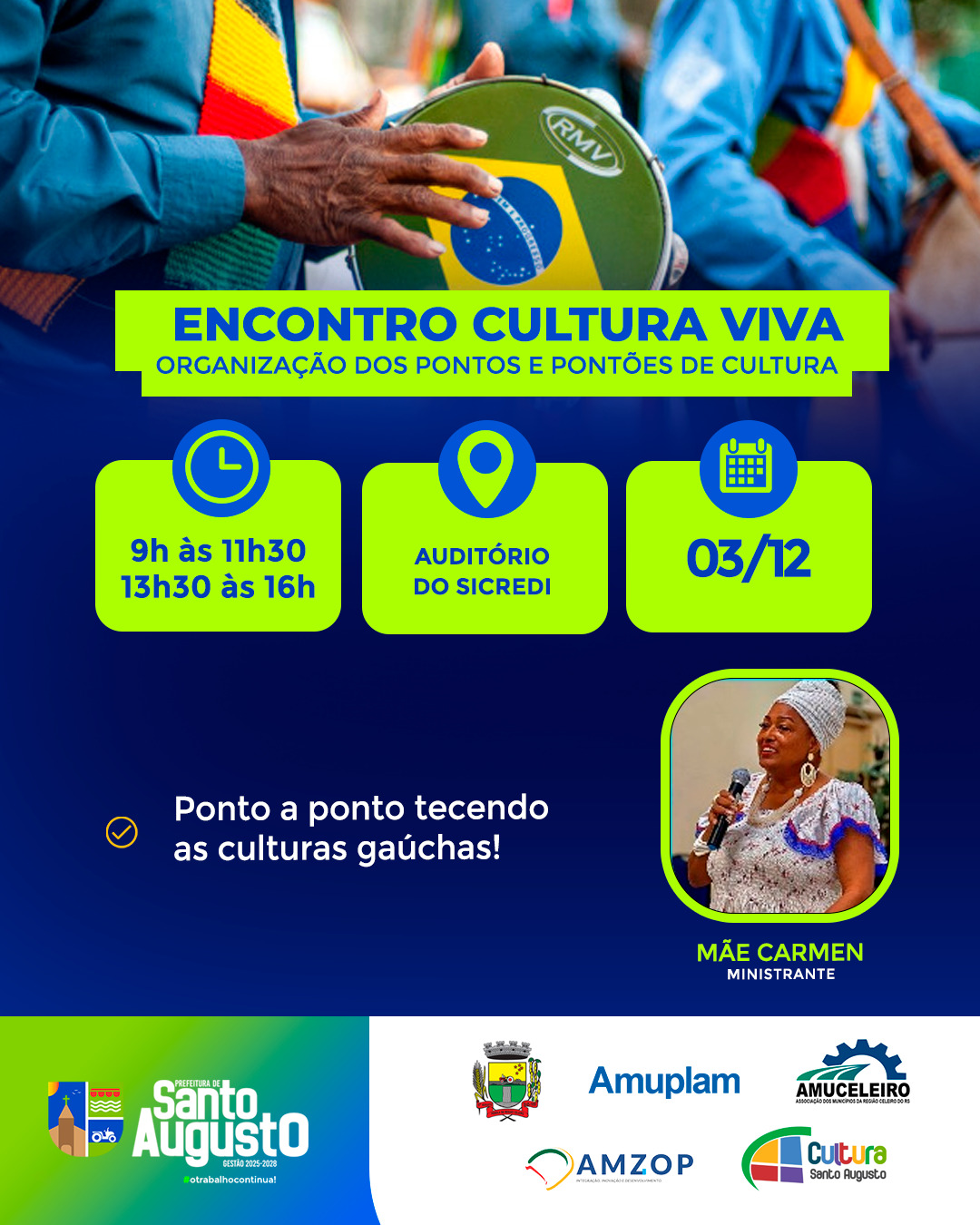 Santo Augusto vai sediar, amanhã, 03, o Encontro Cultura Viva – Organização dos Pontos e Pontões de Cultura – momento de integração, formação e articulação regional voltado ao fortalecimento das políticas culturais nos municípios do Noroeste gaúcho. O evento vai acontecer no Auditório do Sicredi, das 9 às 11h30 e das 13h30 às 16 horas. O debate em Santo Augusto busca fortalecer redes, valorizar identidades e promover políticas culturais mais integradas e efetivas para a região.