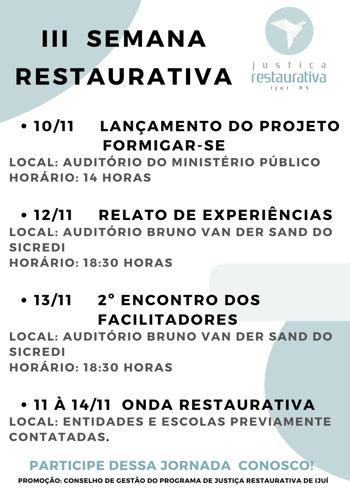 Segundo ela, na semana da Justiça Restaurativa se trabalha com o objetivo de fazer diferente. Para isso, dia 10 haverá o lançamento do projeto Formigar-se, seguido de atividades até dia 14, com participação de diversas entidades e instituições. No ano passado foram 550 pessoas envolvidas. Para este ano, o objetivo é aumentar o número de participantes.