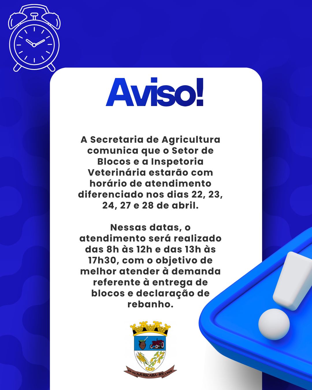 O Setor de Blocos e a Inspetoria Veterinária da prefeitura de Ajuricaba estão com horário de atendimento diferenciado, visto entrega de blocos e declaração de rebanho. Até a próxima terça-feira, os segmentos atuam das 8 horas ao meio-dia e das 13 às 17 horas e 30 minutos.