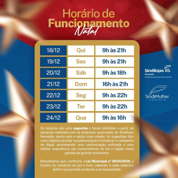O Sindilojas Noroeste informa que realizou uma pesquisa com as empresas associadas, na qual foram apresentadas duas sugestões de horários especiais para o período natalino. Após a votação, o horário que obteve maior aprovação das empresas é o que está sendo divulgado em card anexado na matéria. Conforme a Lei Municipal nº 6645/2018, o horário de funcionamento do comércio de Ijuí é livre, cabendo a cada empresa definir sua própria jornada conforme sua necessidade.