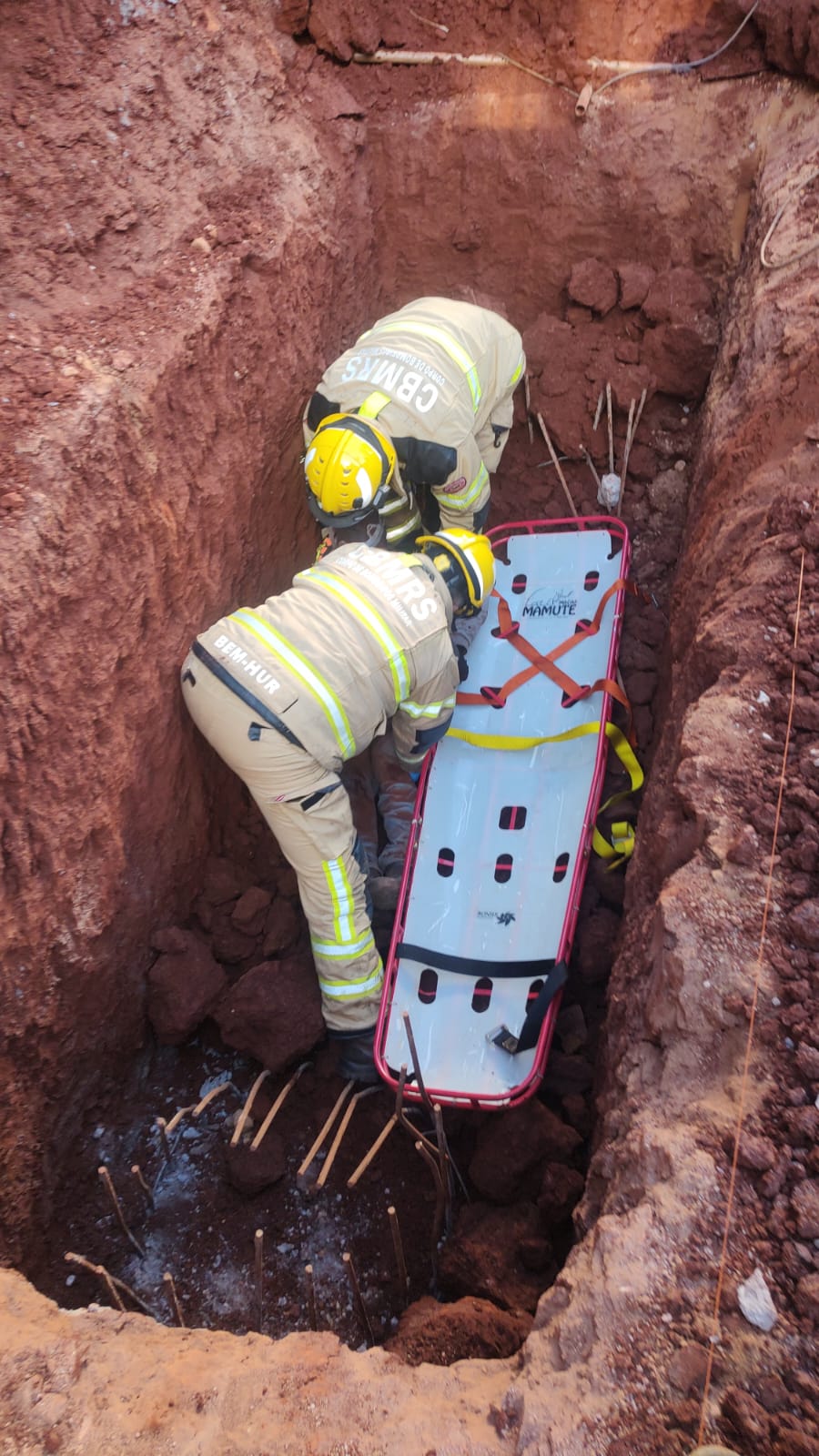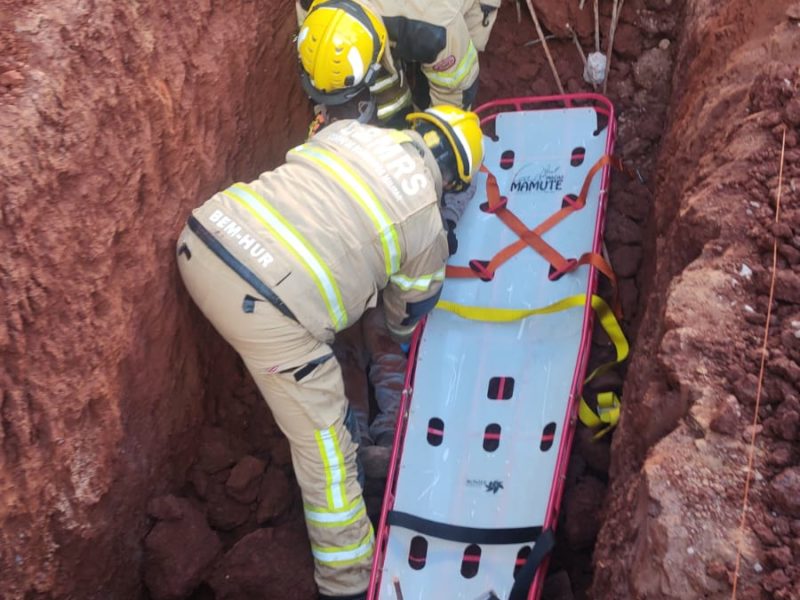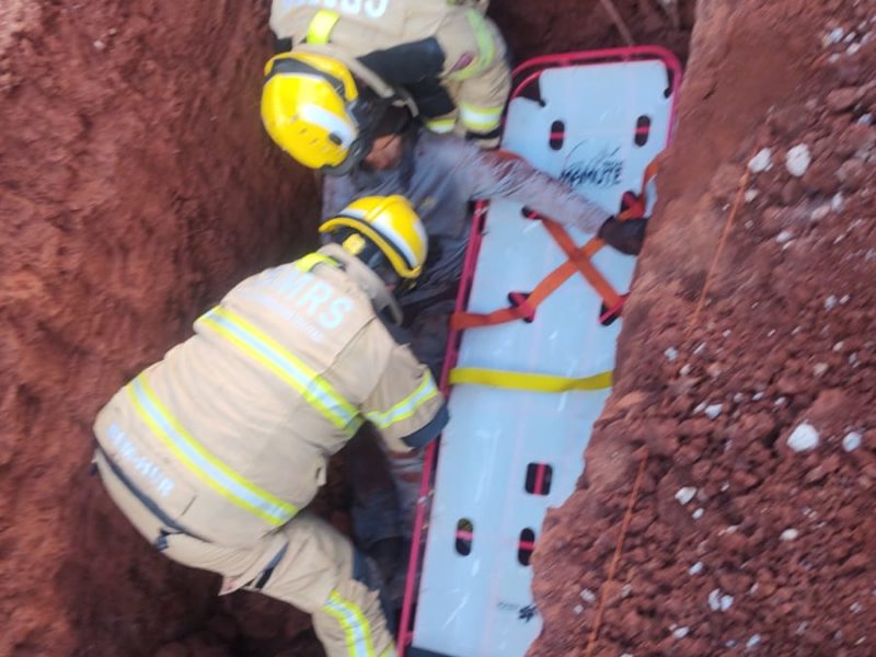 Conforme os bombeiros, a vítima estava consciente, orientada e verbalizando, e parte da terra já havia sido retirada por colegas de trabalho antes da chegada da guarnição.