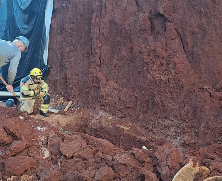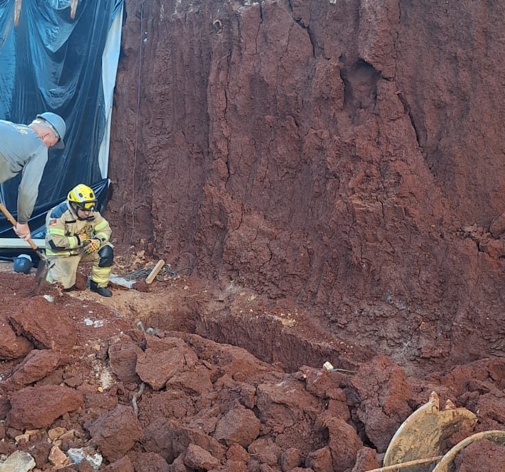 A ocorrência foi atendida pelo Corpo de Bombeiros por volta das 13h50, na Rua Marechal Floriano, após um deslizamento de terra no interior de uma sapata de concretagem com cerca de 2,5 metros de altura.