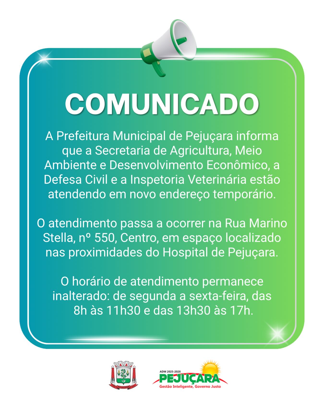 A secretaria de Agricultura, Meio Ambiente e Desenvolvimento Econômico, a Defesa Civil e a Inspetoria Veterinária de Pejuçara atendem em novo endereço, de forma temporária. Os serviços são prestados à rua Marino Stella, nº 550, centro da cidade, proximidades do hospital de Pejuçara. O horário de atendimento permanece inalterado, ou seja, de segunda a sexta-feira, das 8h às 11h30 e das 13h30 às 17h.
