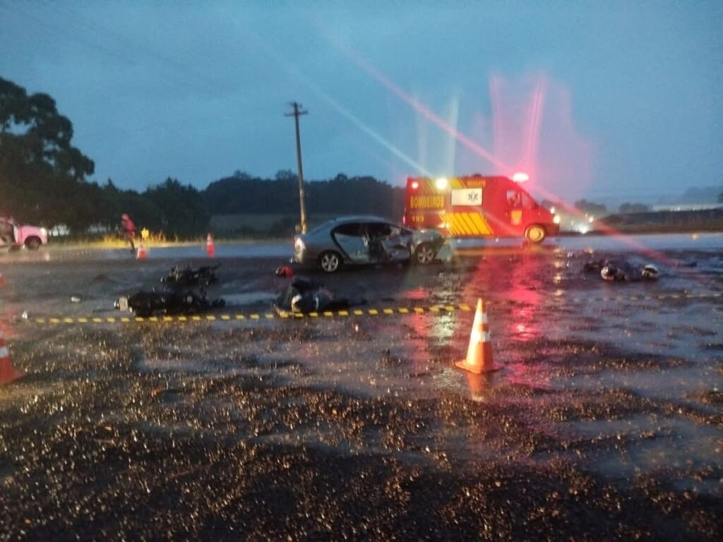 Informações preliminares indicam que o motorista do carro teria perdido o controle do veículo após aquaplanar, atingindo lateralmente as motocicletas. As circunstâncias serão apuradas pelas autoridades.