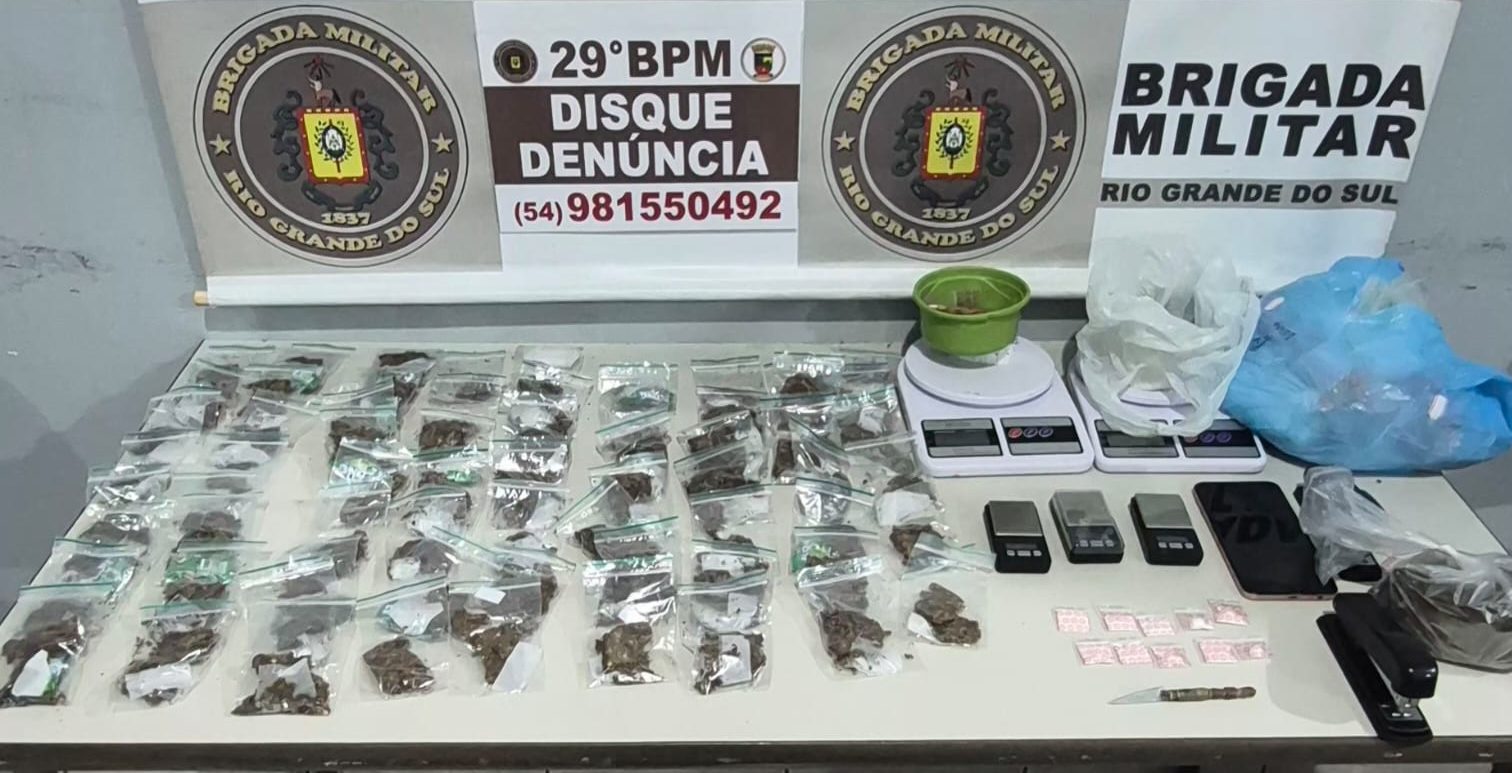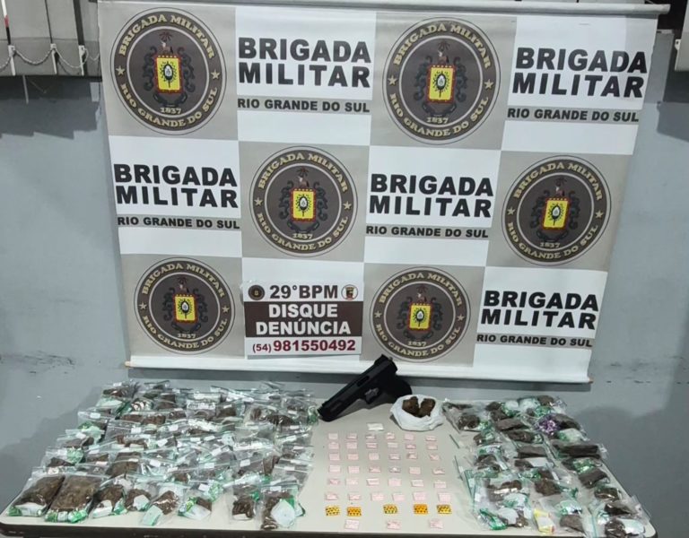 Policiais visualizaram o momento em que uma mulher chegou na residência informada e largou com um homem uma sacola. Posterior, a suspeita saiu em um veículo de aplicativo, em direção ao bairro São José. Uma equipe da BM de Ijuí abordou o suspeito em frente a residência e com ele localizou, dentro da sacola, 34 porções de maconha, 45 porções de cocaína e um simulacro de arma de fogo.