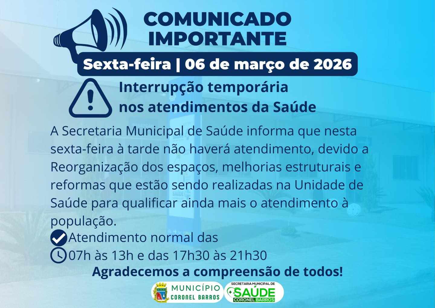 Hoje à tarde não haverá atendimento na Unidade de Saúde de Coronel Barros. A interrupção ocorre devido à reorganização dos espaços internos, melhorias estruturais e reformas. Com isso, nessa sexta-feira na UBS de Coronel Barros os serviços são prestados das 7 às 13 horas, e das 17 e 30 às 21 e 30.