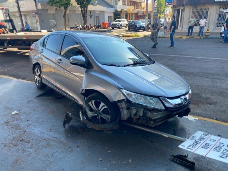 Com a força do impacto, a condutora do automóvel perdeu o controle da direção, subiu na calçada e acabou colidindo contra uma placa de trânsito. Os danos no veículo foram de grande monta.